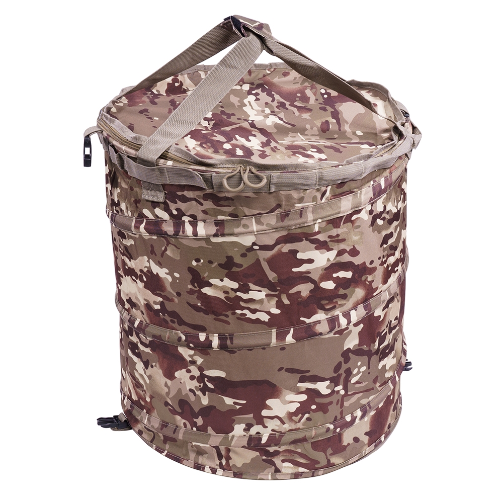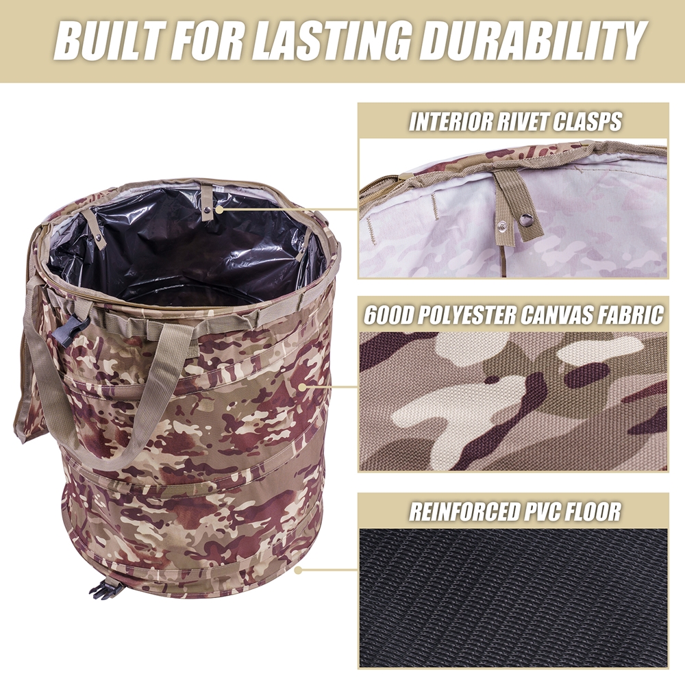 - Built in straps with rivet clasps hold trash bags open, exterior MOLLE loops provide extra storage mounts, stake loops with brass ring inserts keep the bin steady in high wind