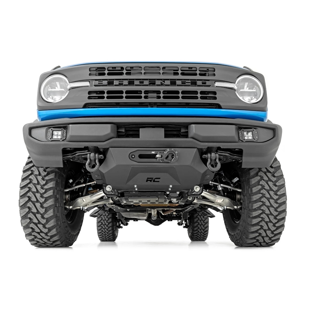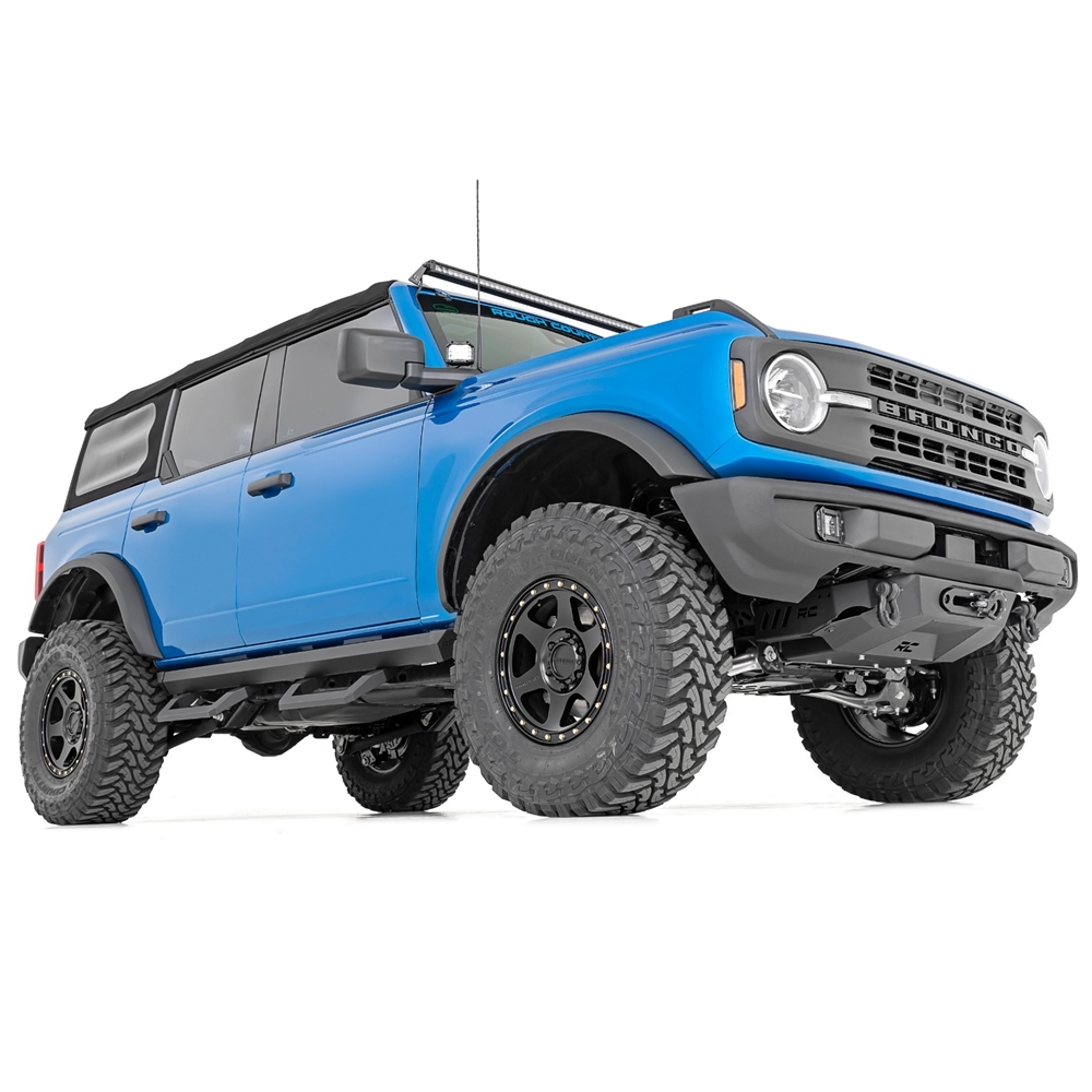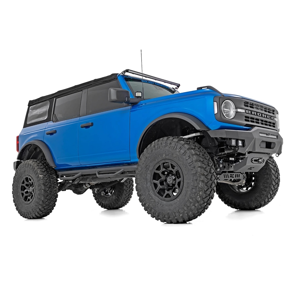 Improved Ground Clearance and Ride Quality. The Ford Bronco is back and better than ever! Rough Country has hit the ground running to give your 2021-up Ford Bronco an improved, aggressive stance with a 7-inch lift kit! This suspension kit provides everything needed to lift your vehicle, giving you increased ground clearance to run larger tires while reducing the nose-down factory look for a commanding presence.