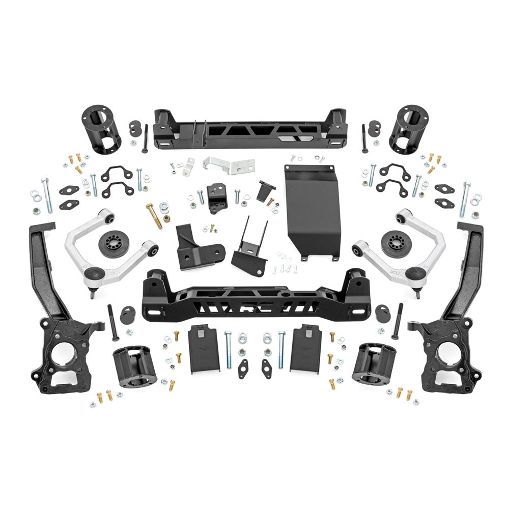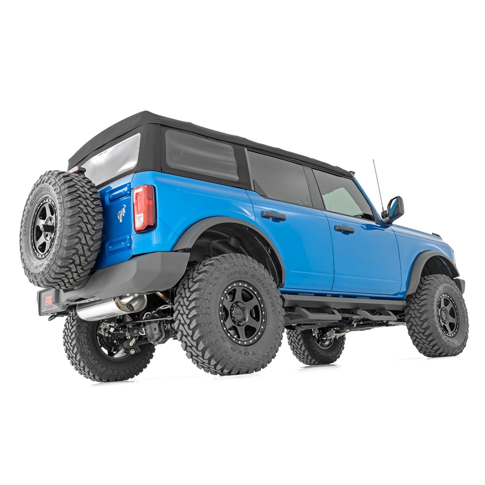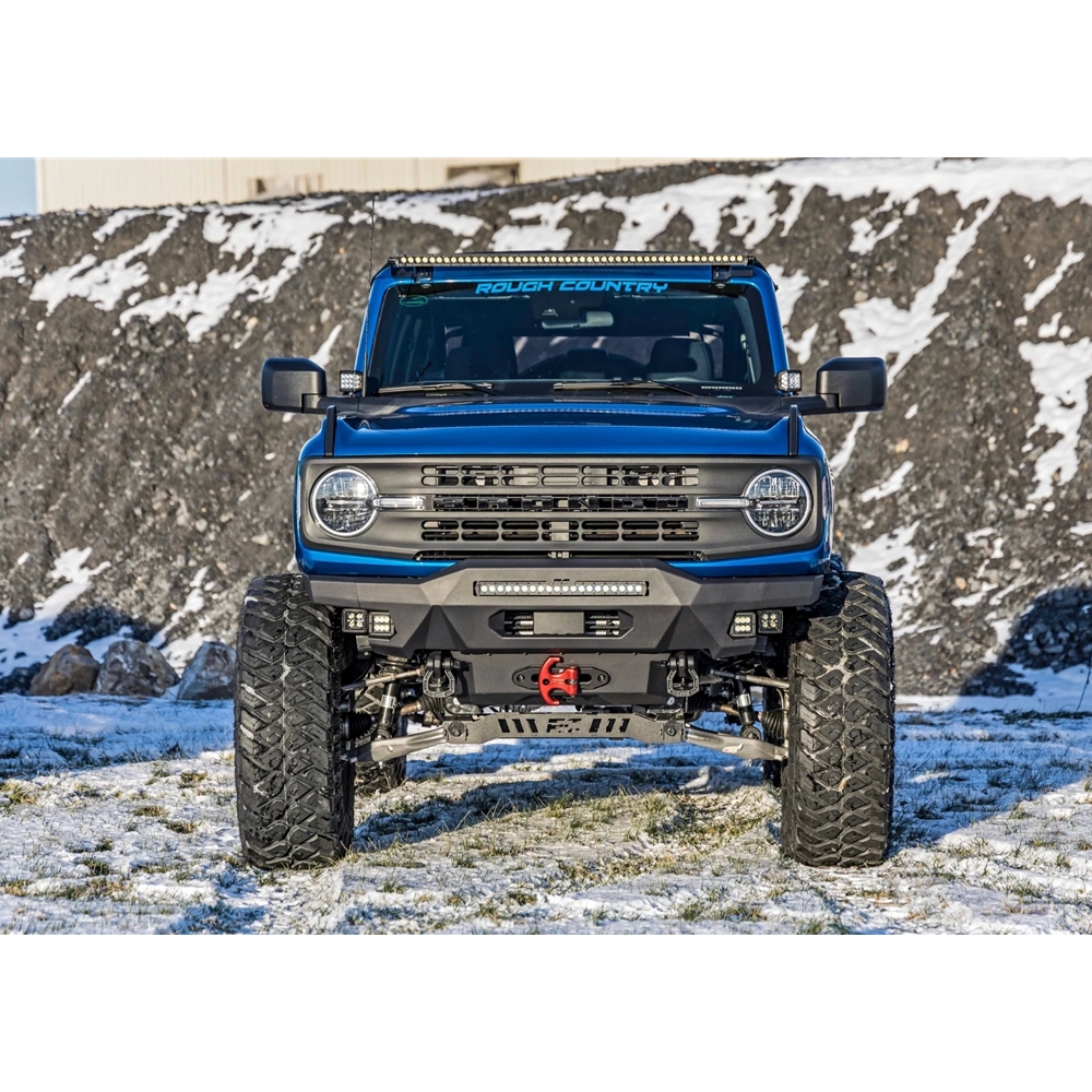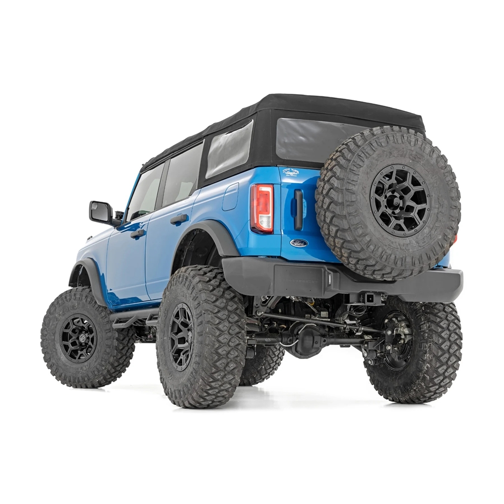 Improved Ground Clearance and Ride Quality. The Ford Bronco is back and better than ever! Rough Country has hit the ground running to give your 2021-up Ford Bronco an improved, aggressive stance with a 7-inch lift kit! This suspension kit provides everything needed to lift your vehicle, giving you increased ground clearance to run larger tires while reducing the nose-down factory look for a commanding presence.